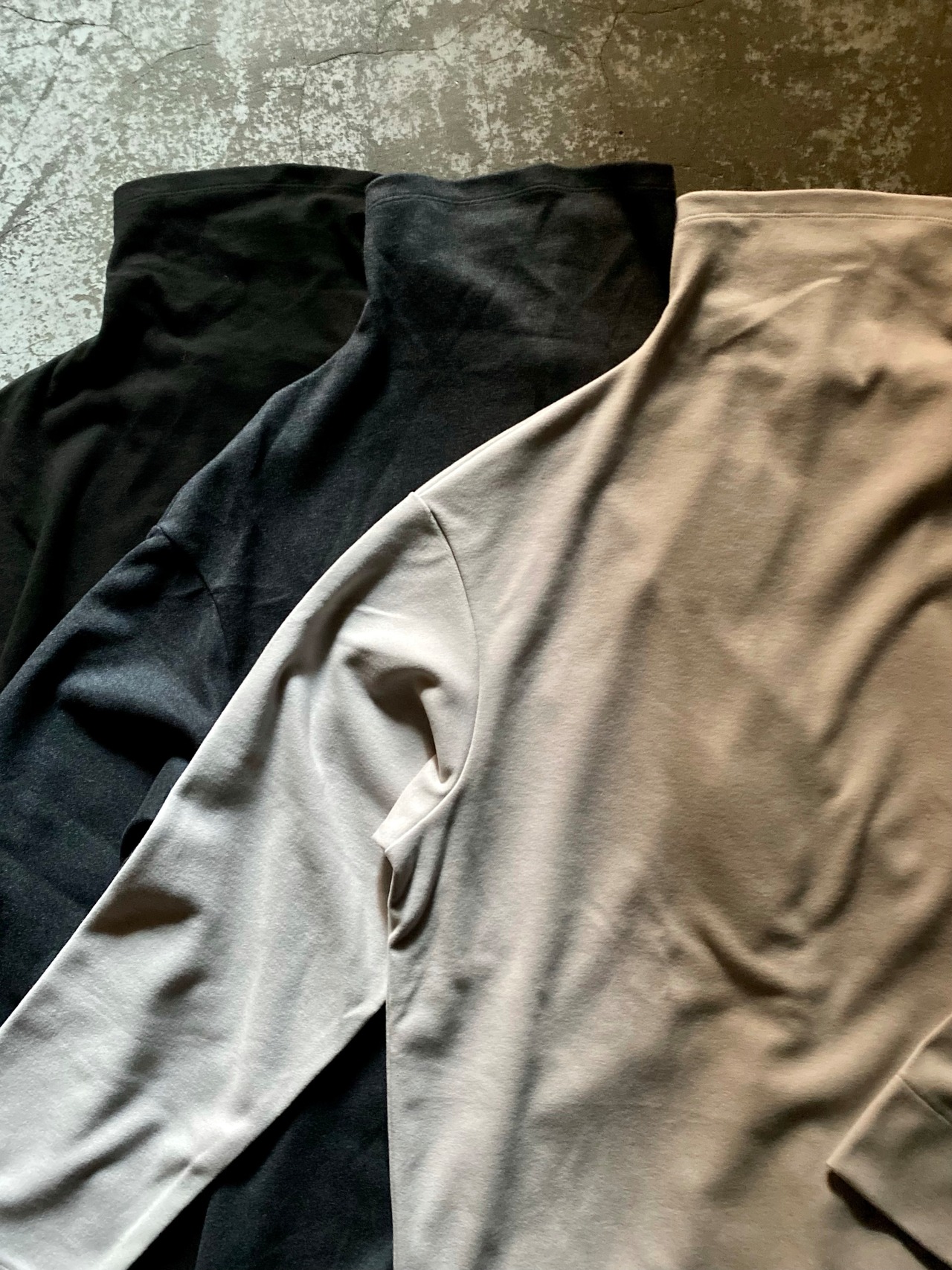 エード調の肌触りの良いボトルネックニットソー。ハイゲージのニット着ているような上品さと着やすい肉感なのでトップに持っていってもインナーとしても着回しの効く冬のコーディネートのマルチアイテムです。