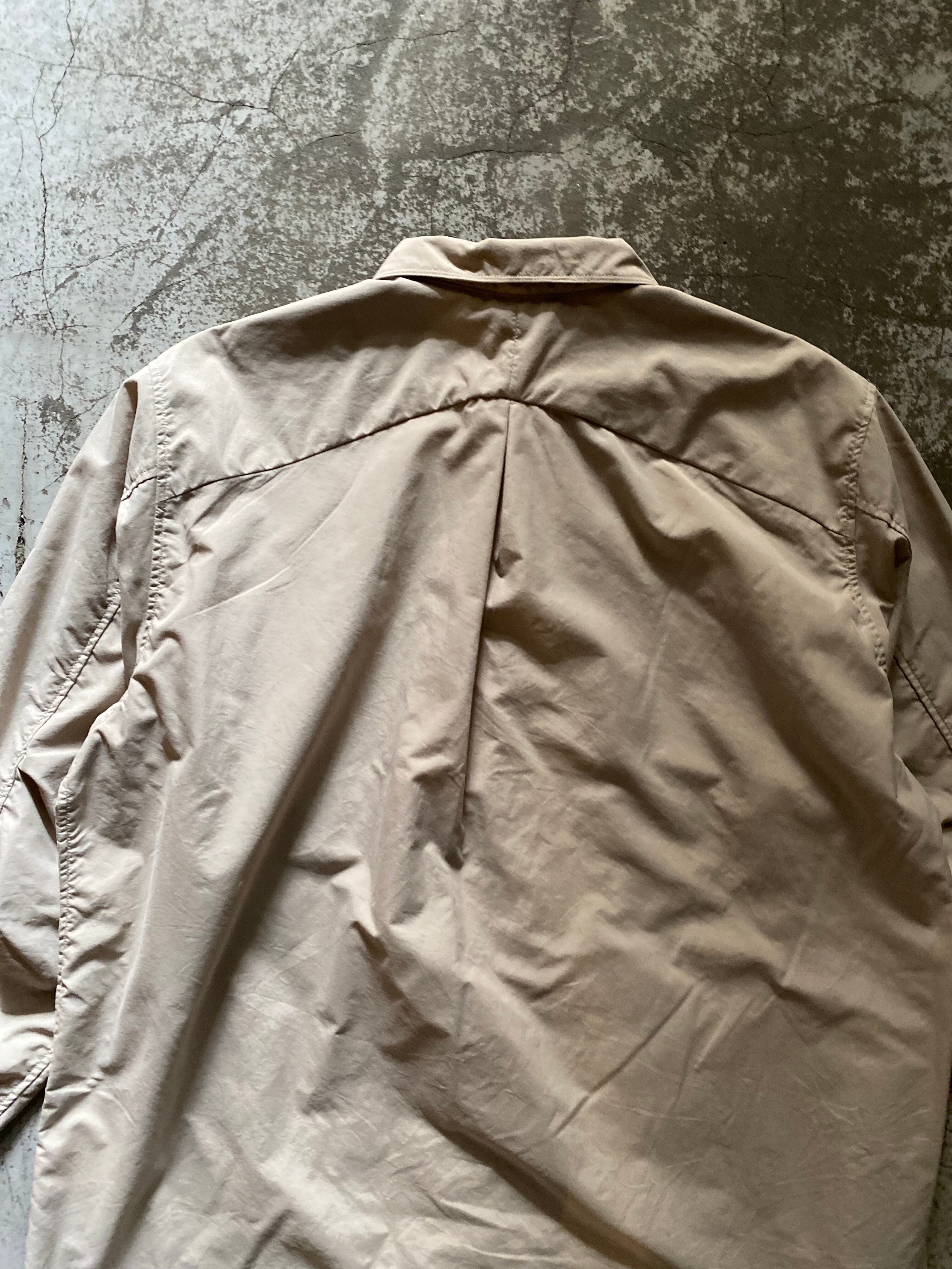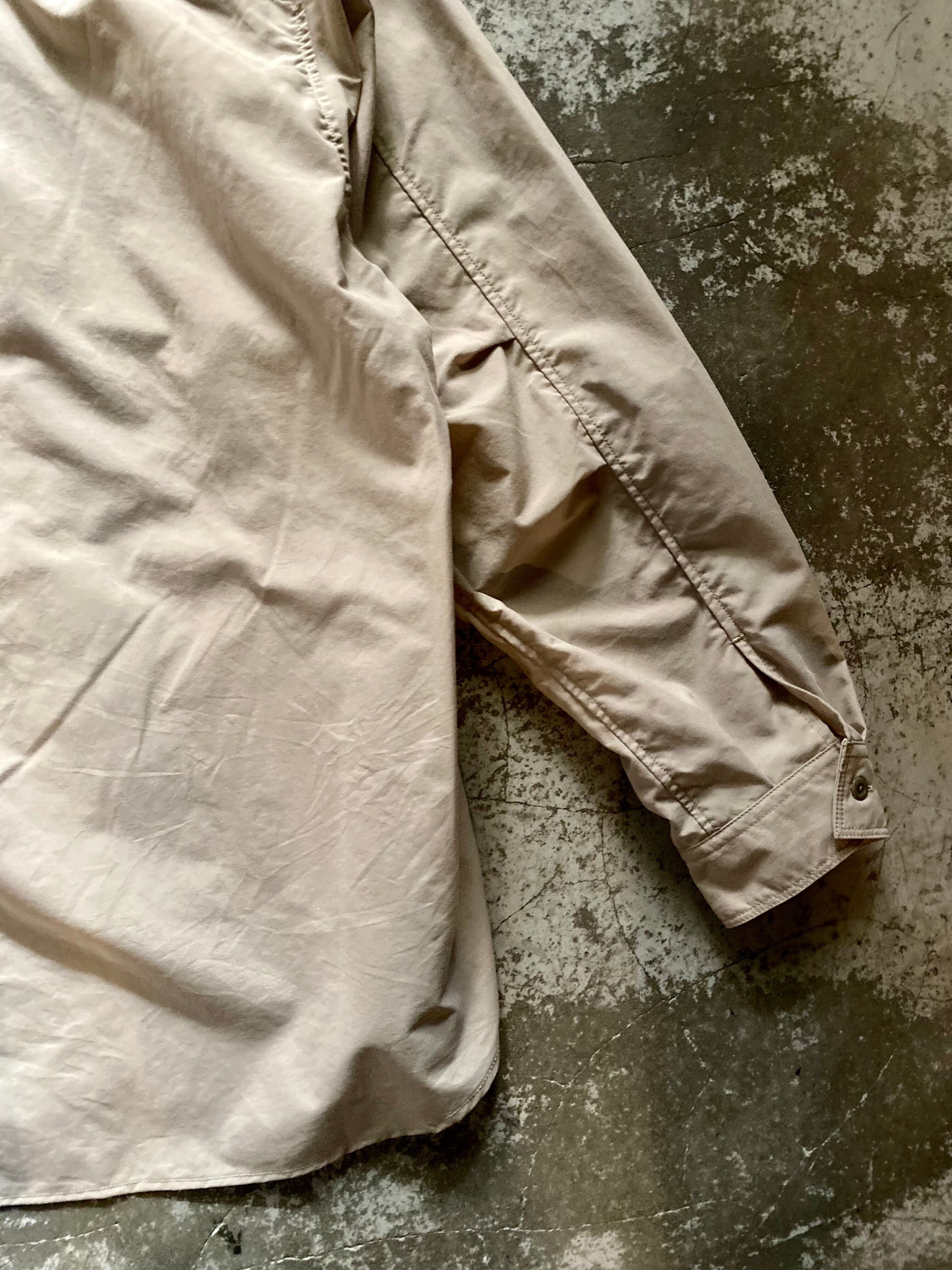 デザインはシンプルなレギュラーカラーシャツですが、ポケット袋をステッチで押さえた両脇のシームポケット、変形のバックヨークとプリーツ、そしてミリタリーコートのように袖を2枚袖にし、肘部分にタックを取りボリュームを持たせたディテールが特徴です。