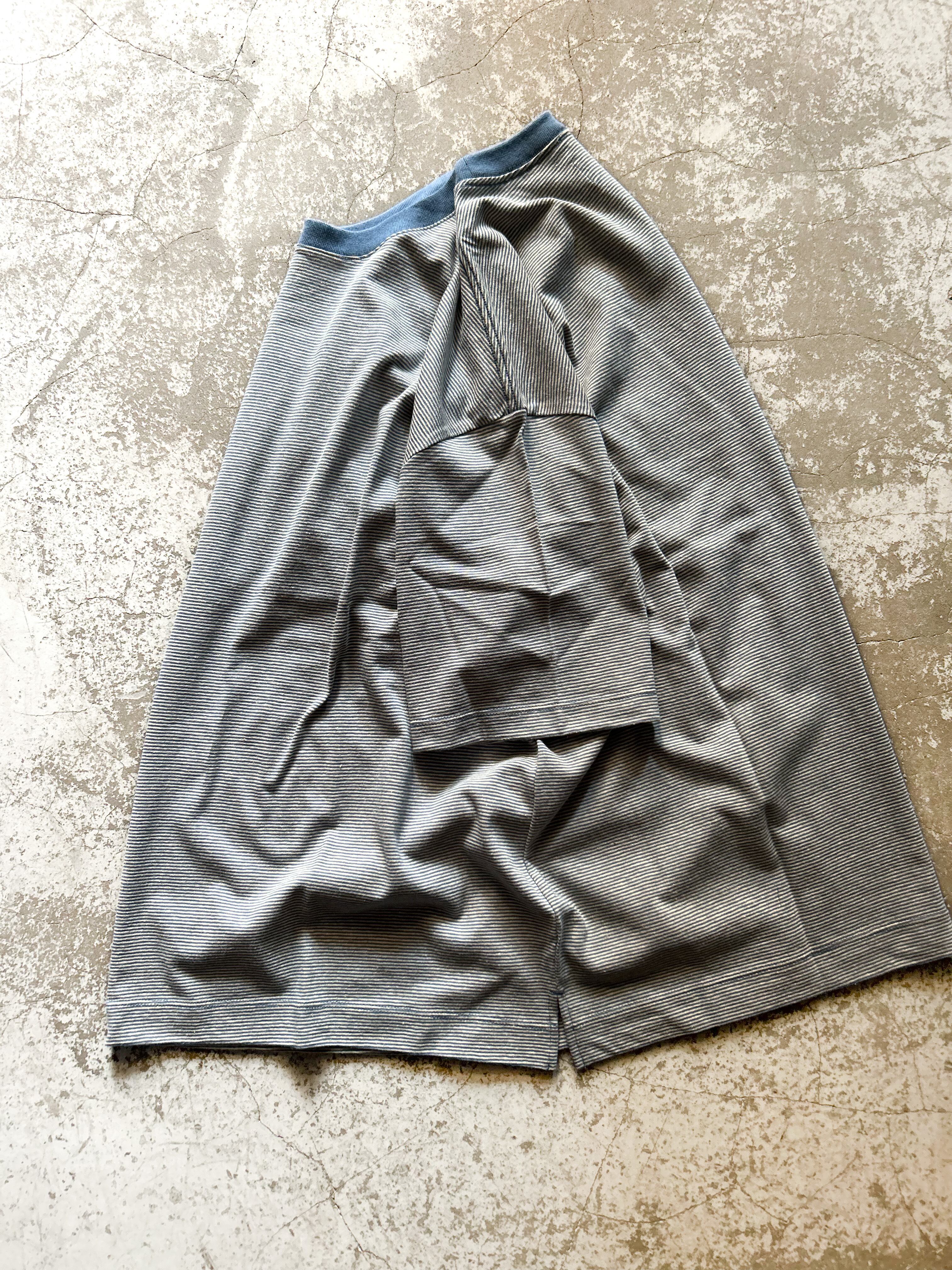 オーガニックコットンとヘンプを交互に編立てた独特のネップ感とナチュラルで味のあるカラーリングが印象的なミジンボーダー天竺を使用。