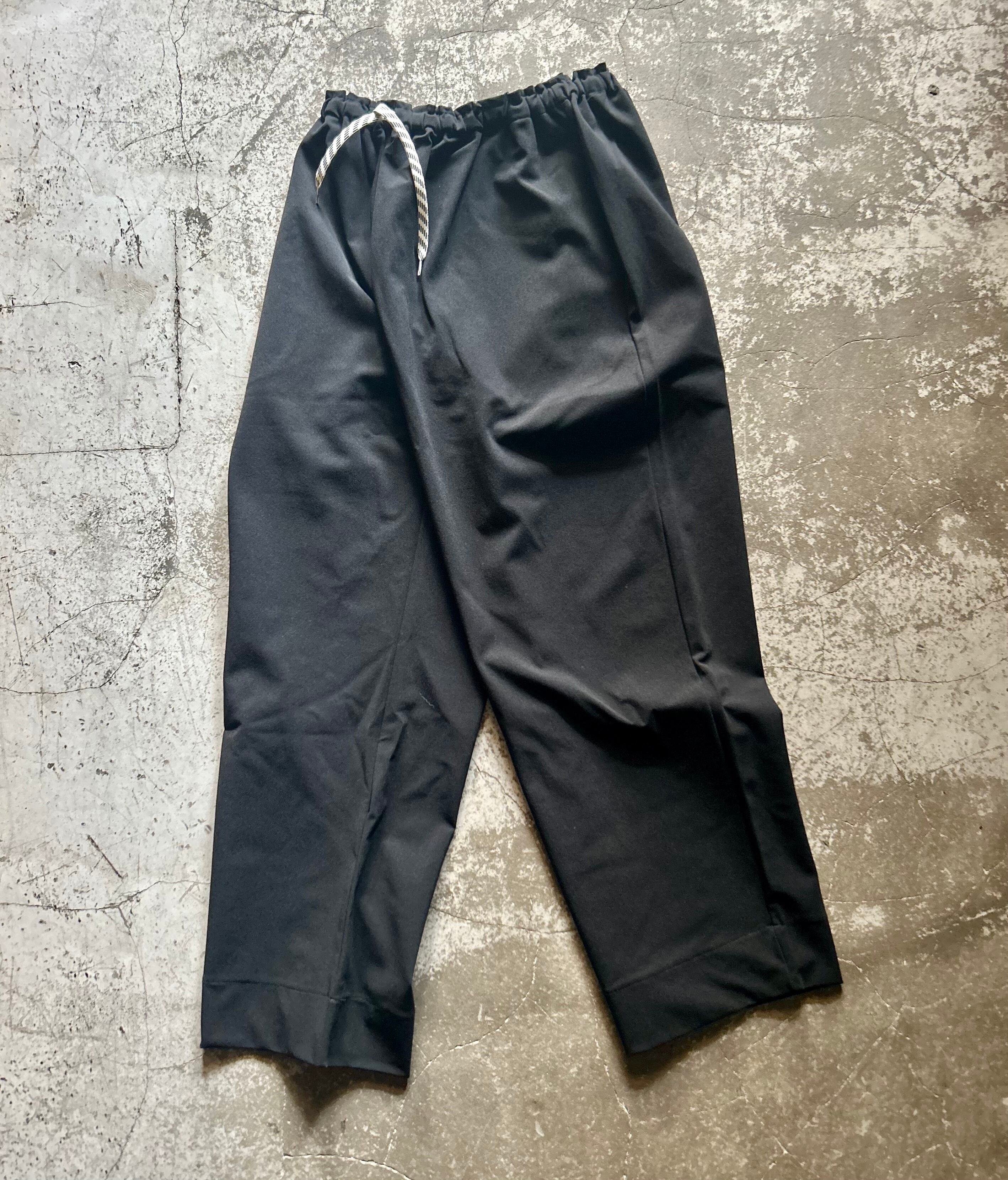 3本のナイロン糸で編まれた鹿の子組織ならではのハリ感と光沢感、肉感があり、ウエストから裾口までのワイドなシルエットで大人っぽさとリラックス感を持ち合わせています。