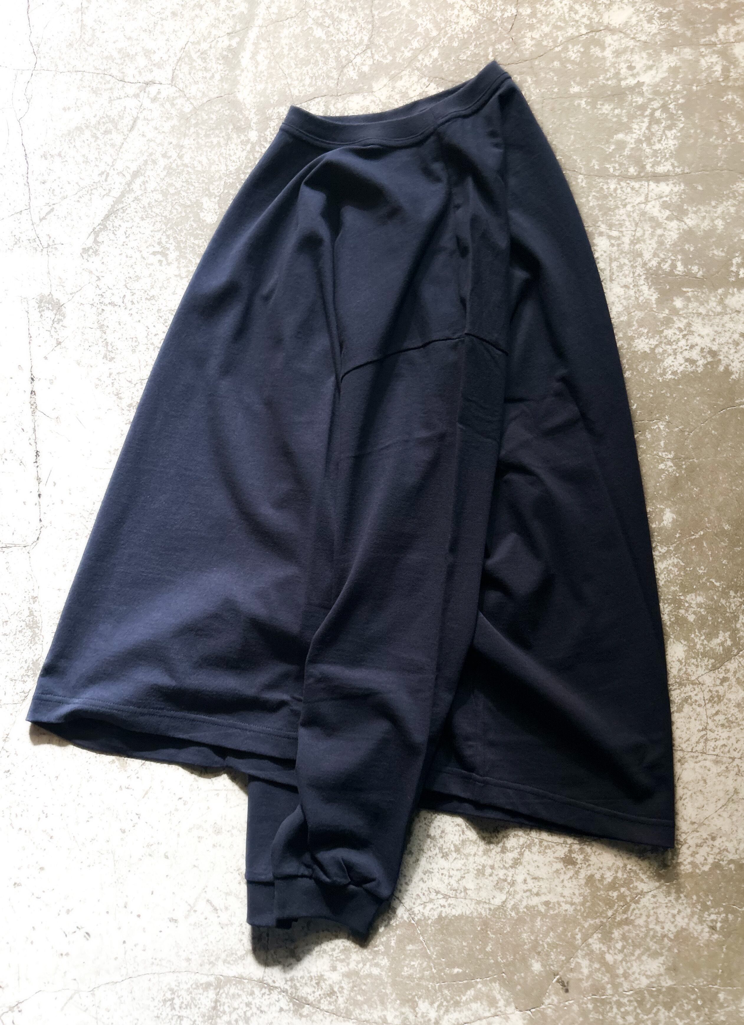 18/1の太番手の空紡糸を使用した度詰めでありながら軽やかでドライな生地感とゆったりとしたサイズ感が生み出すさらっとした肌触りと動きのあるシルエットが心地いいロンT。