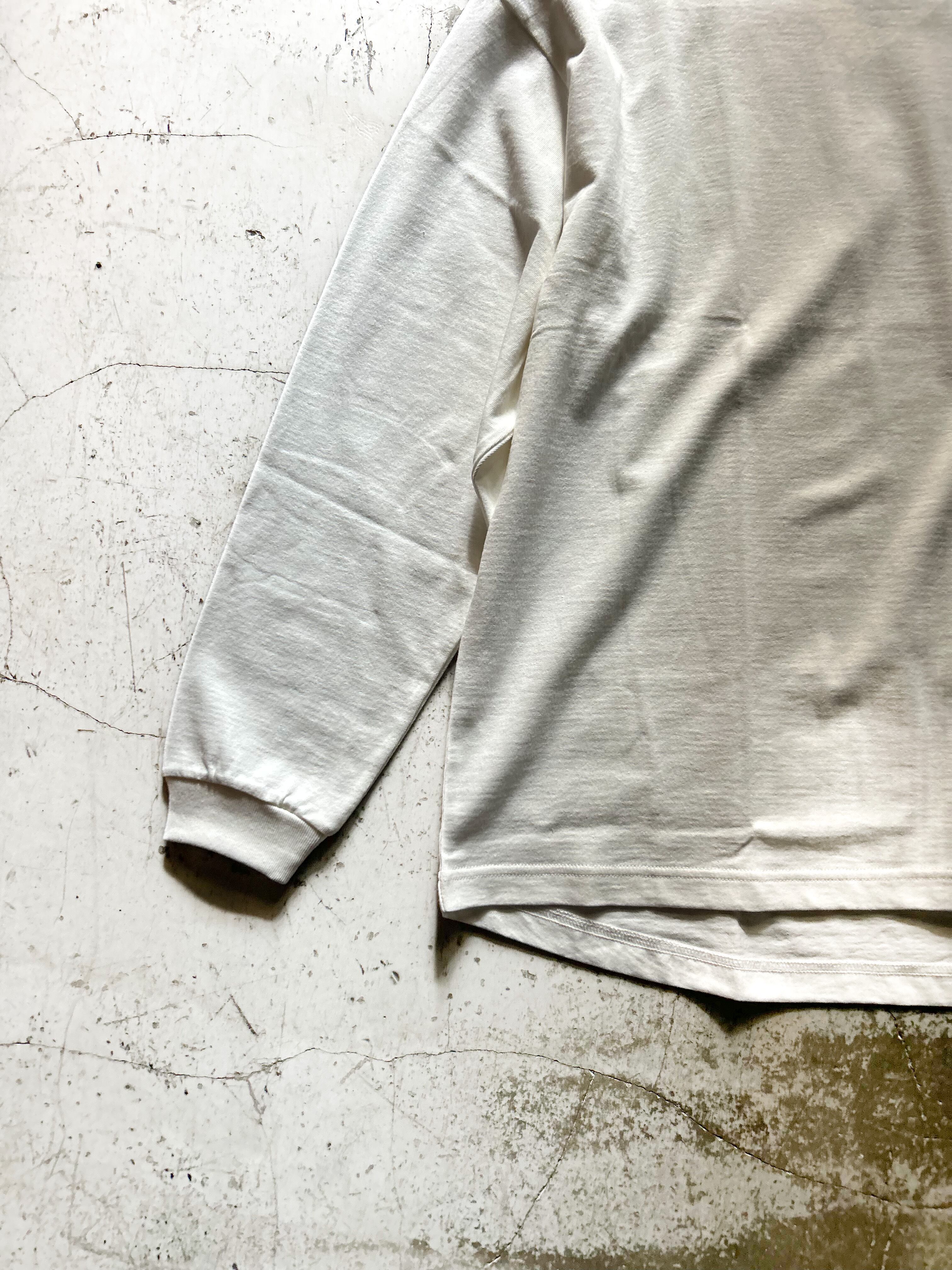 18/1の太番手の空紡糸を使用した度詰めでありながら軽やかでドライな生地感とゆったりとしたサイズ感が生み出すさらっとした肌触りと動きのあるシルエットが心地いいロンT。