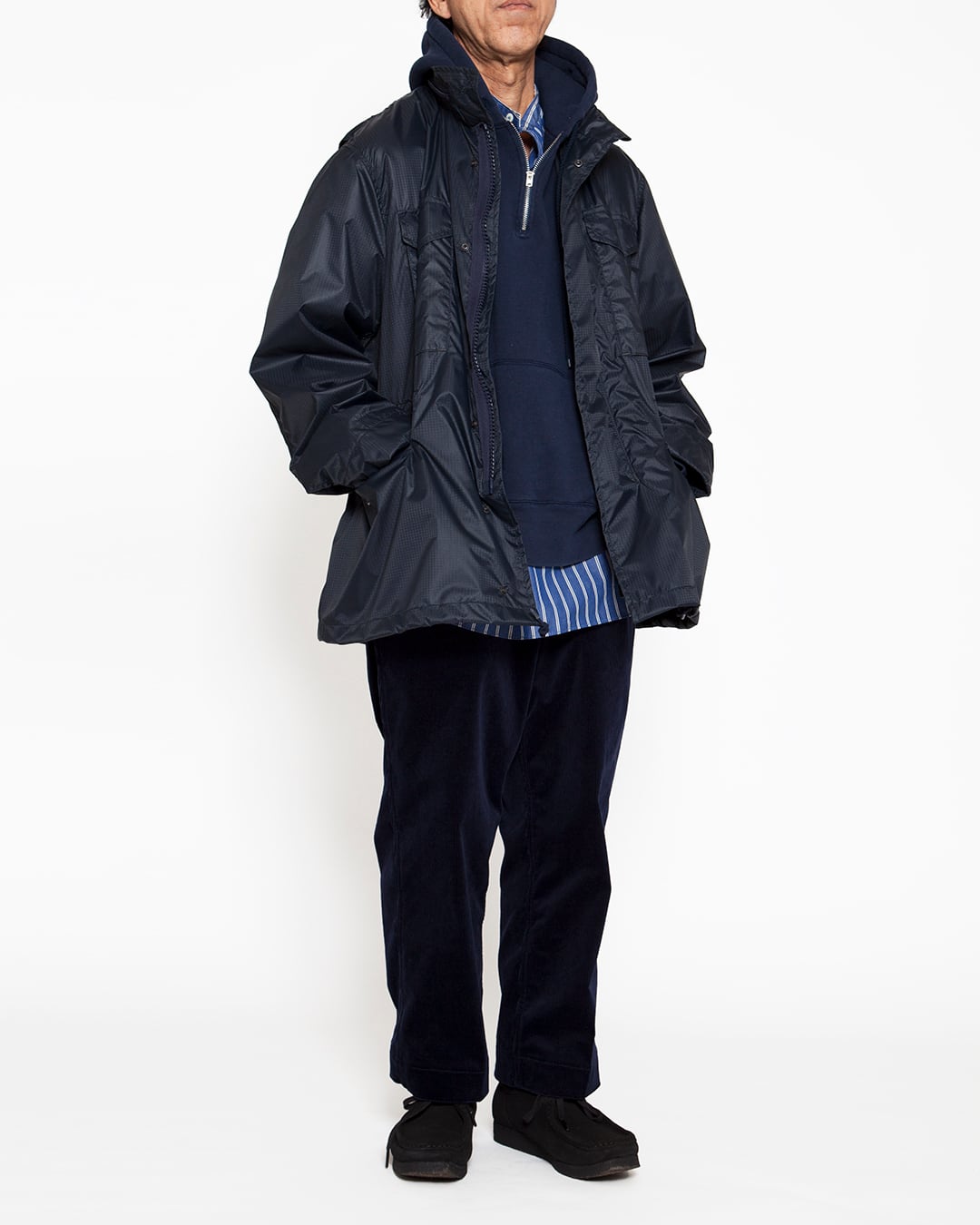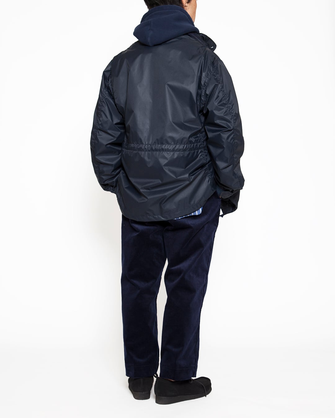 フードが仕込まれているジッパー付きスタンドカラー、大きな胸ポケット、2本のタックが入った太い袖、各所にベルクロを使用したライナーが脱着できるザックリとしたフィット感など、M-65の完成度の高さを出来るだけ活かすため、フィットやディテールの省略などの若干の修正以外は略ストレートに作っています。