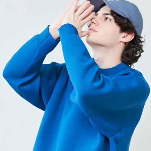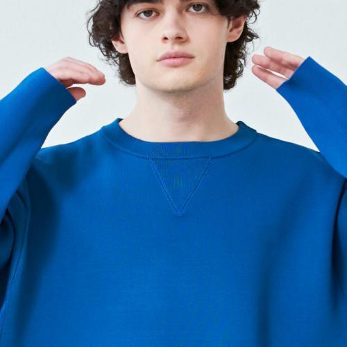 伸縮性の高いポリエステル糸を使用しハイゲージに編み立てたニット。ダイバー素材のように張りがでるように編み立てた素材感は、着用するとほどよく膨らみのあるシルエットになります。ヴィンテージのスウェットをモチーフに脇〜袖下をリブ編みで編み地を変えたデザイン。首元にはV字ガゼットをリブ編みで作成したパーツを取り付けクラシカルな雰囲気を残しつつアップデートしたデザインです。