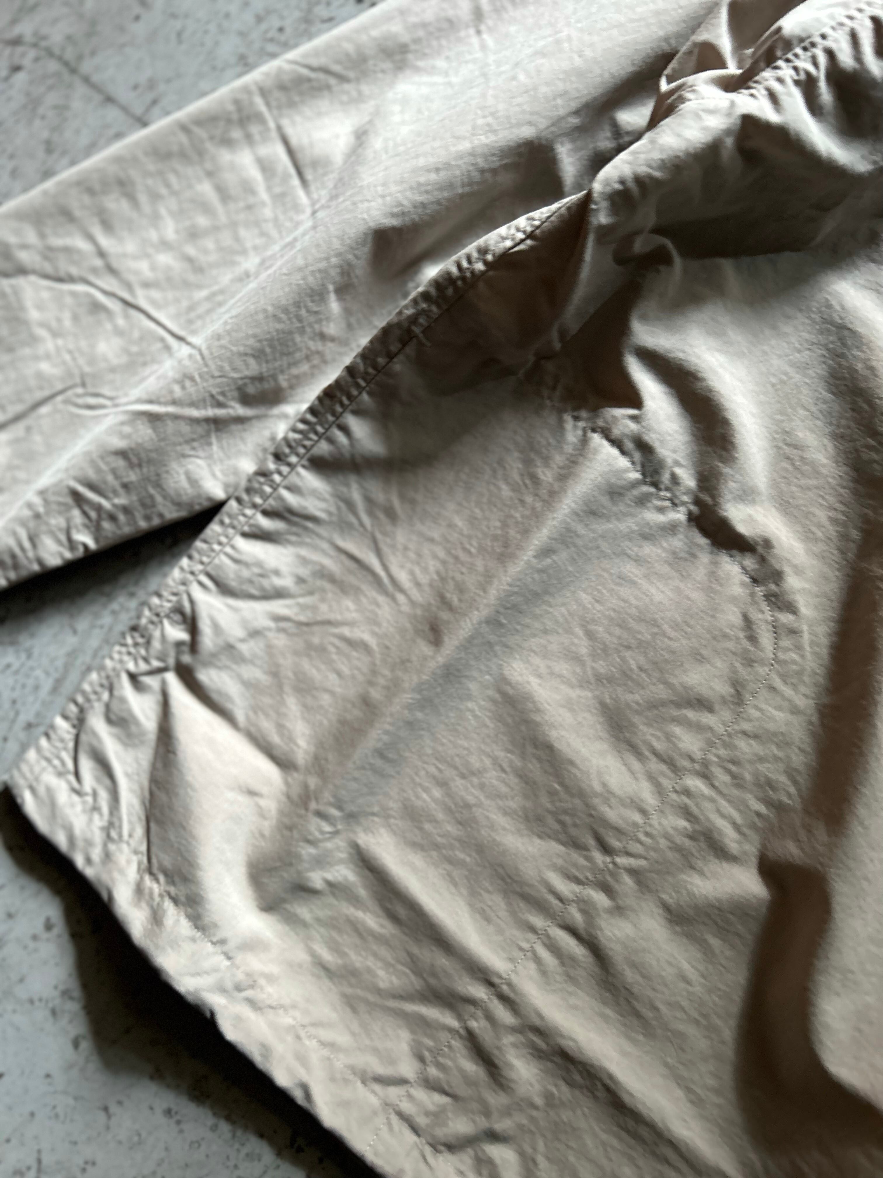 アノラックのようにアウターとして、またスウェットのような気軽さの持ち合わせたシルエットとデザインに仕上げています。裾はスピンドルで調整しブラウジングも可。そして袖を2枚袖にし、肘部分にタックを取りボリュームを持たせたディテールが特徴です。
