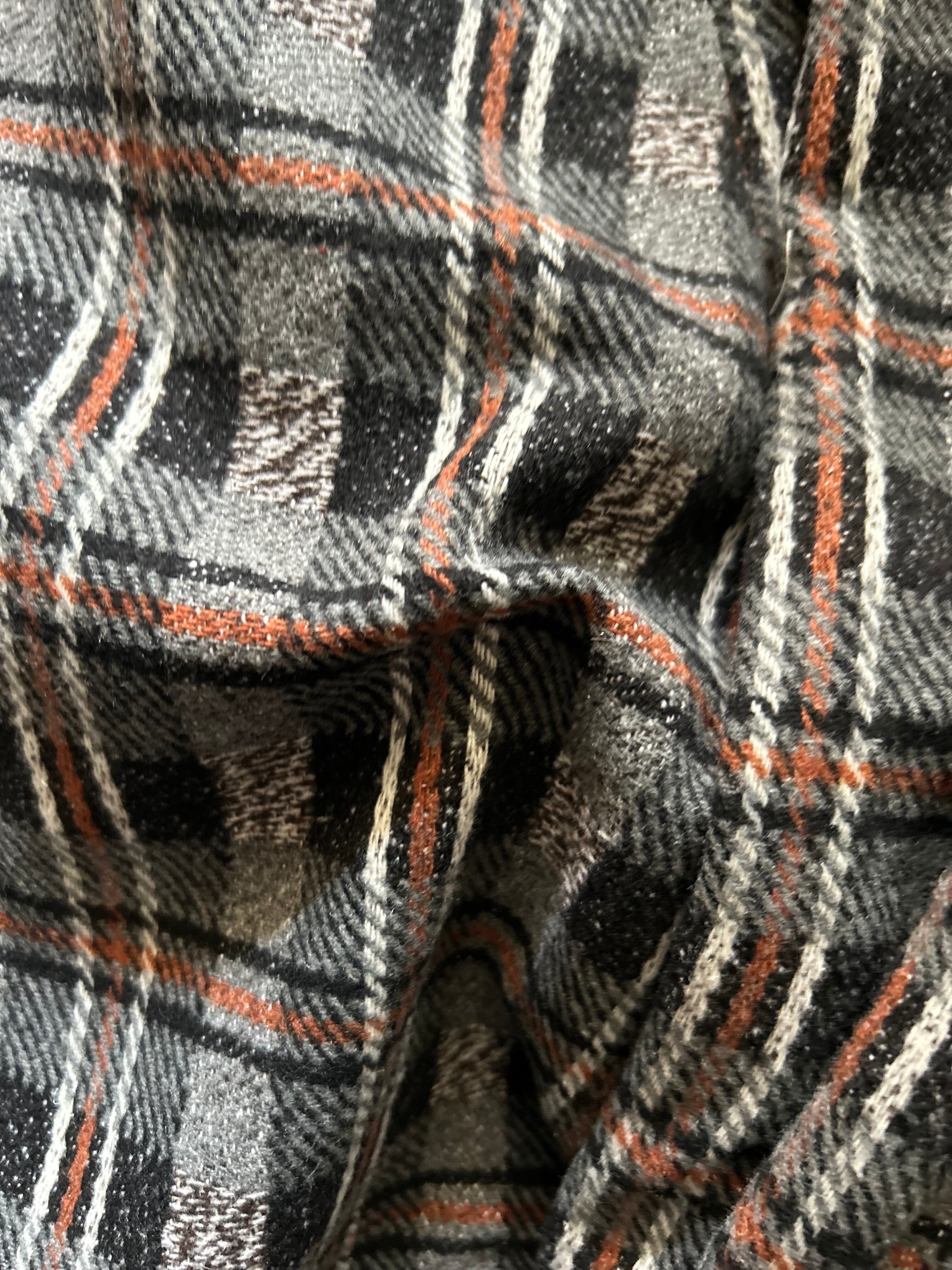 甘織りの柔らかいファブリックのチェック素材を使用したシャツジャケット。前立ての内側はグログランテープを当てた仕様。太巾の玉縁ポケット、極力ステッチワークを隠した縫製とバックのタックを持たせて出した丸みをおびるパターンで作成したシルエットは抜け感とクリーンな印象が楽しめる1枚となっています