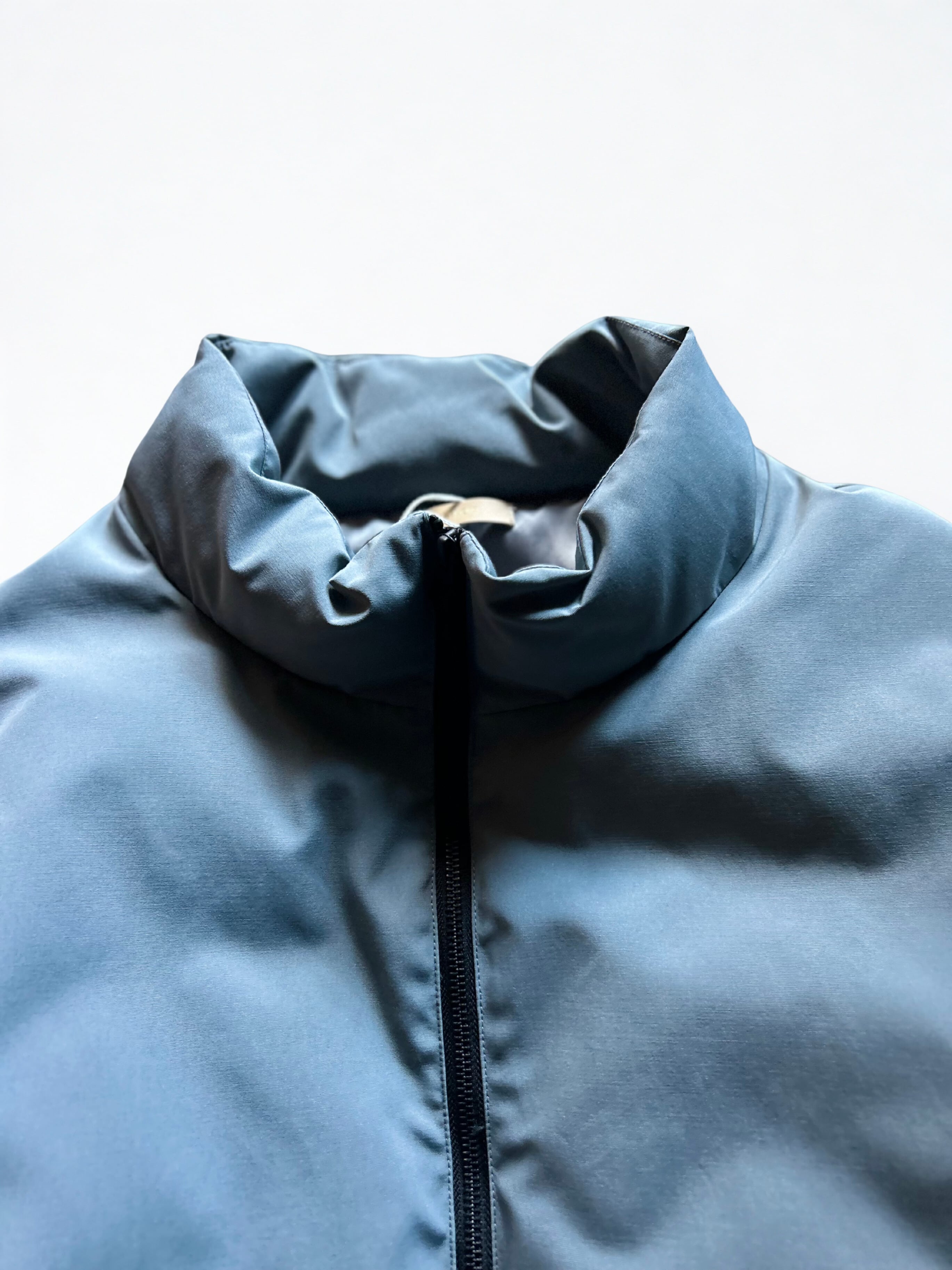 高密度の撥水性のあるナイロンウェザークロスを使用し中綿にはダウン90%・フェザー10%でタウンユース向きのダウン量に設定されています。ショート丈のブルゾンタイプでフォルムの良いスタンドカラーが今っぽくアームホールもゆったりしているので着回しも効きます。ダブルジップ仕様、裾にはドローコードが配置されシルエット調整ができます。