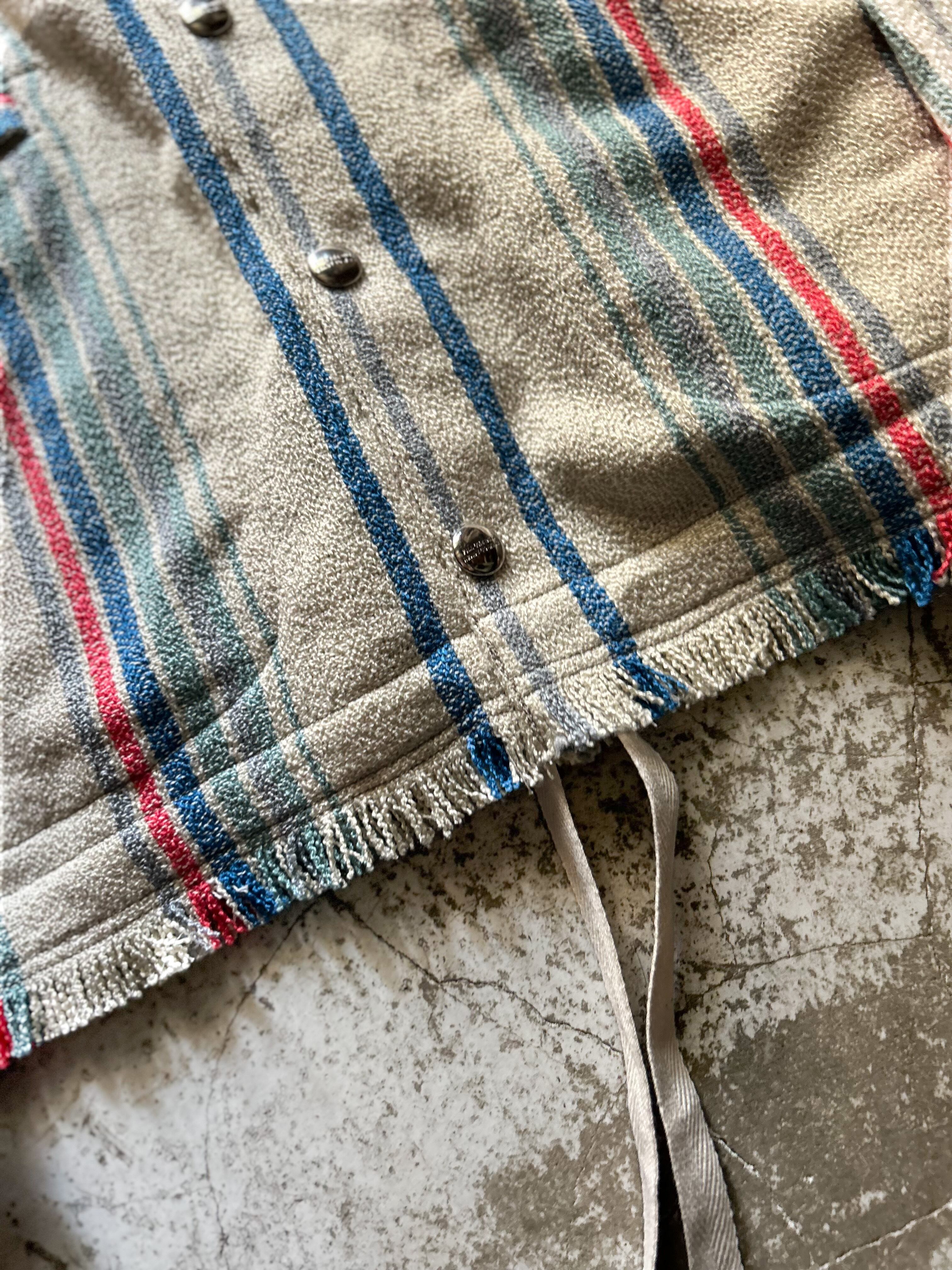 プ。フリンジ加工がポイントでコンチョボタンもついてオールドスクールな南アメリカ内陸の雰囲気と洒落たデザインが妙にセレブ感あります。アクリルコットンなので軽さもあり、乾きも早くゆとりのあるシルエット、丈は短めの作りです。