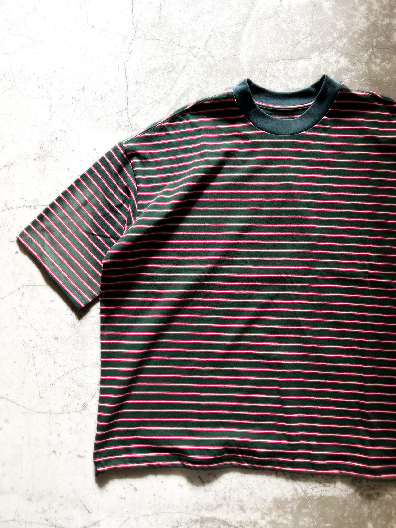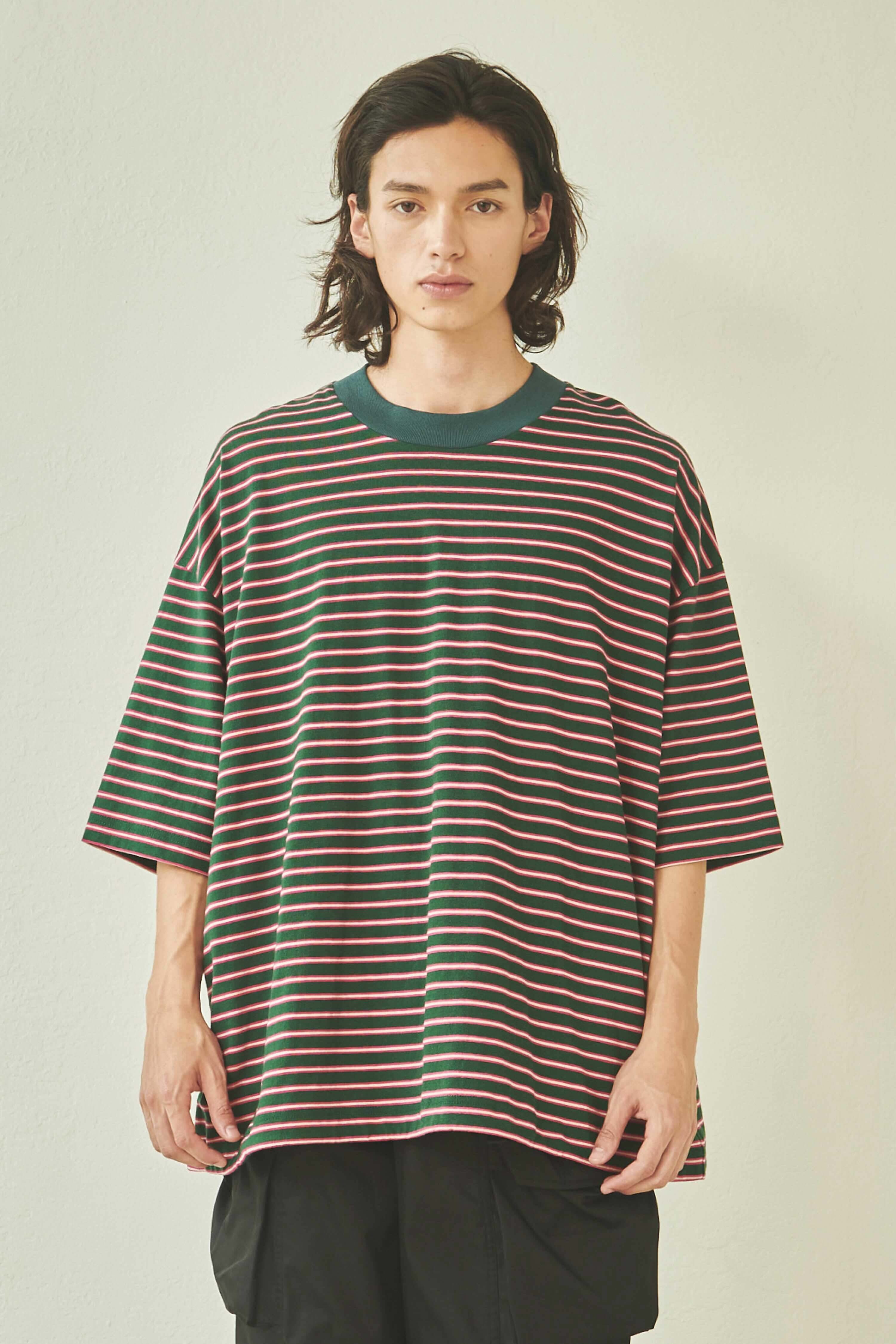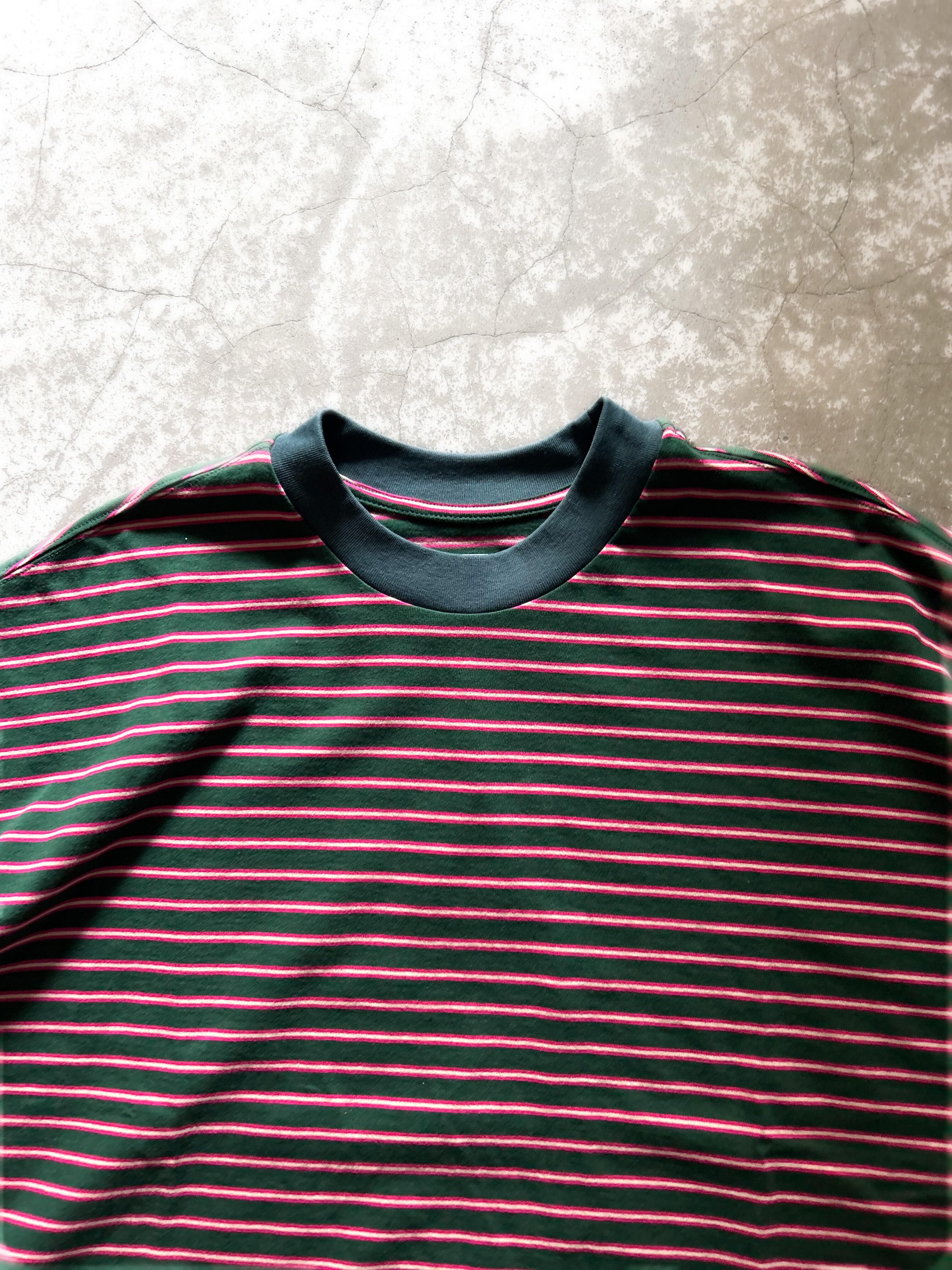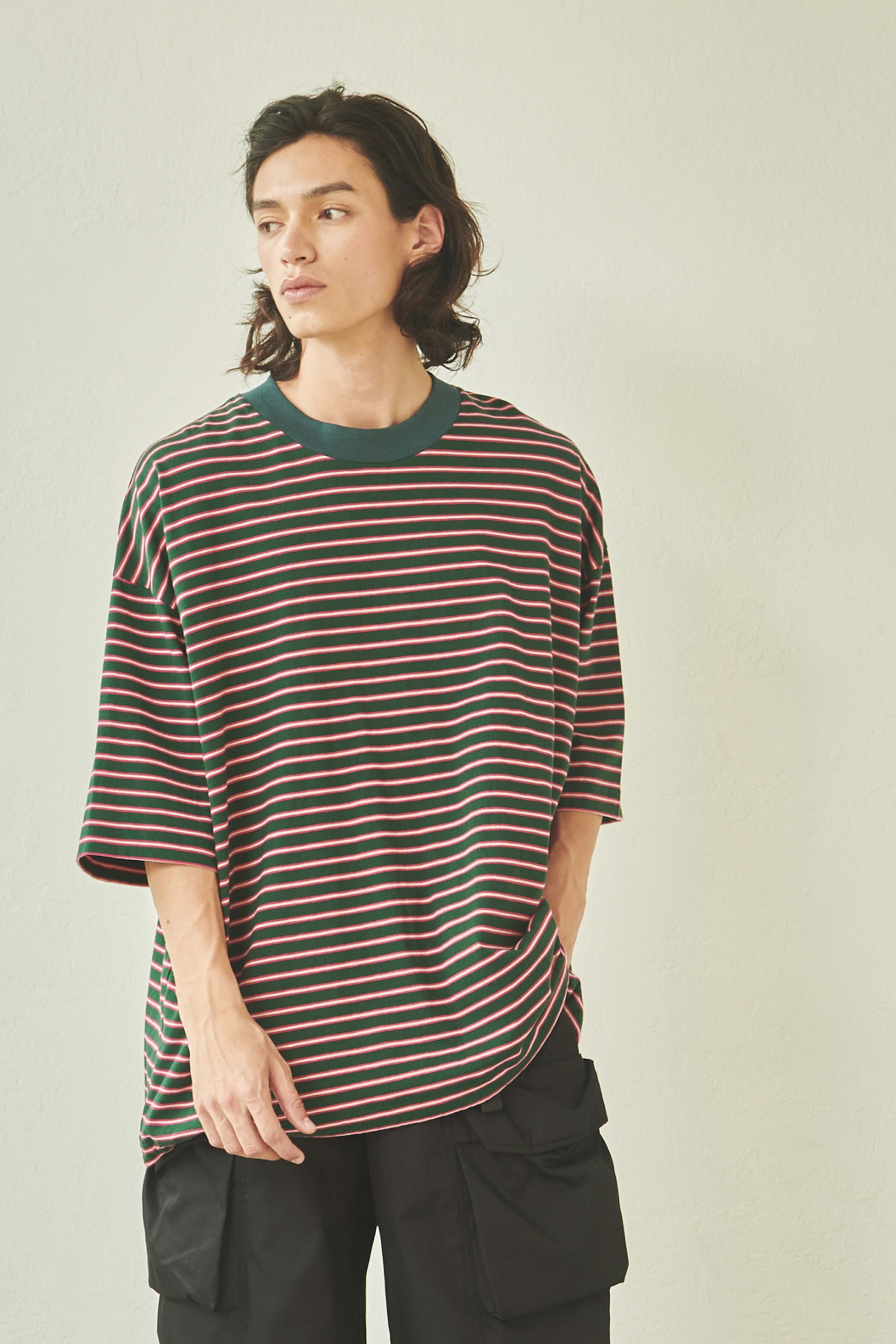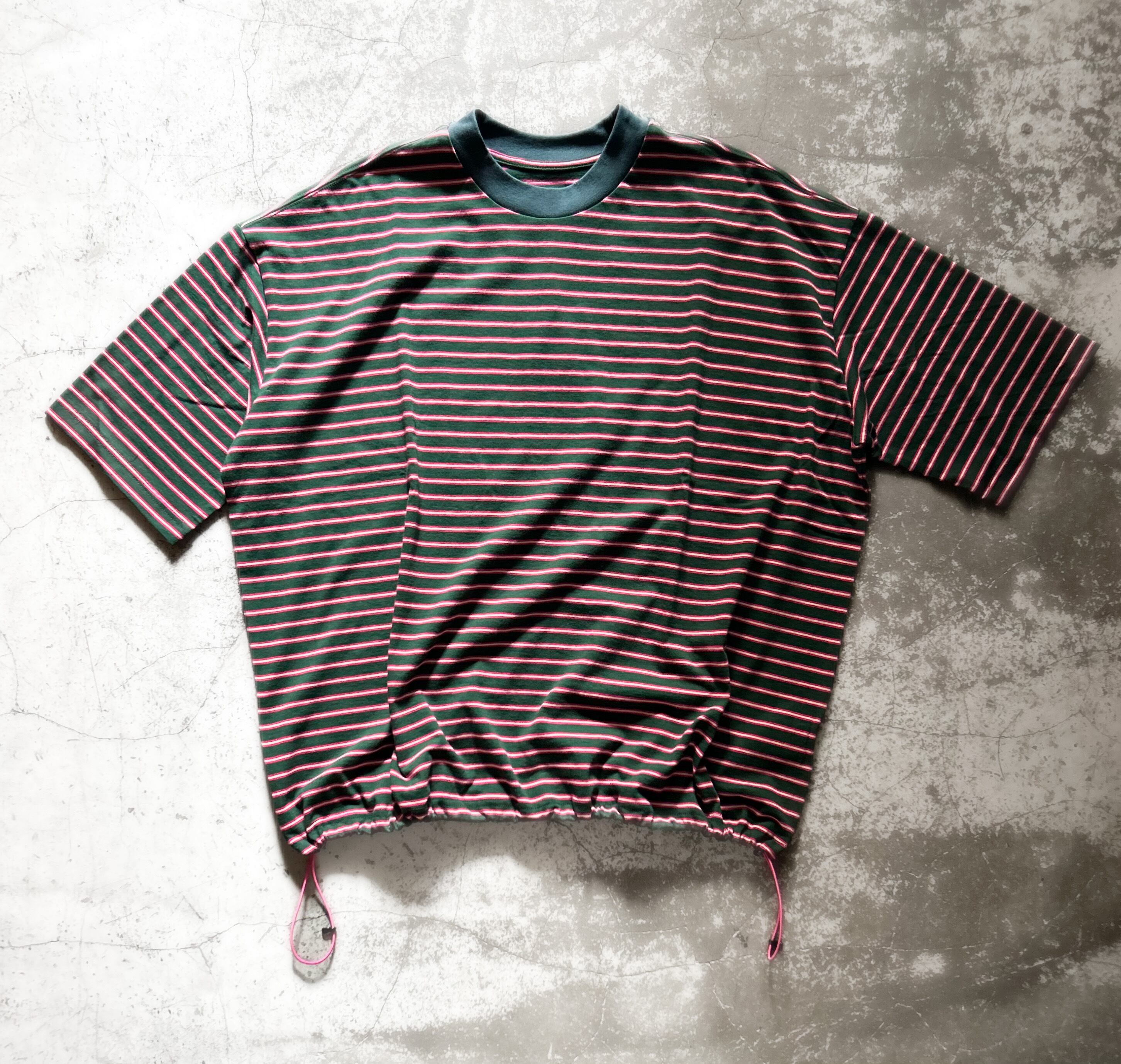 ワイドシルエットのボーダートップ。裾に入った配色のスピンドル を絞ることでバルーンシルエットに変形をさせて着用が楽しめる1点。裾の配色のスピンドル はカラーはボーダーのカラーにリンクさせた配色となっています。オールド感のあるボーダー柄が印象的なデザインなのでロングシーズン着回せるアイテムです。