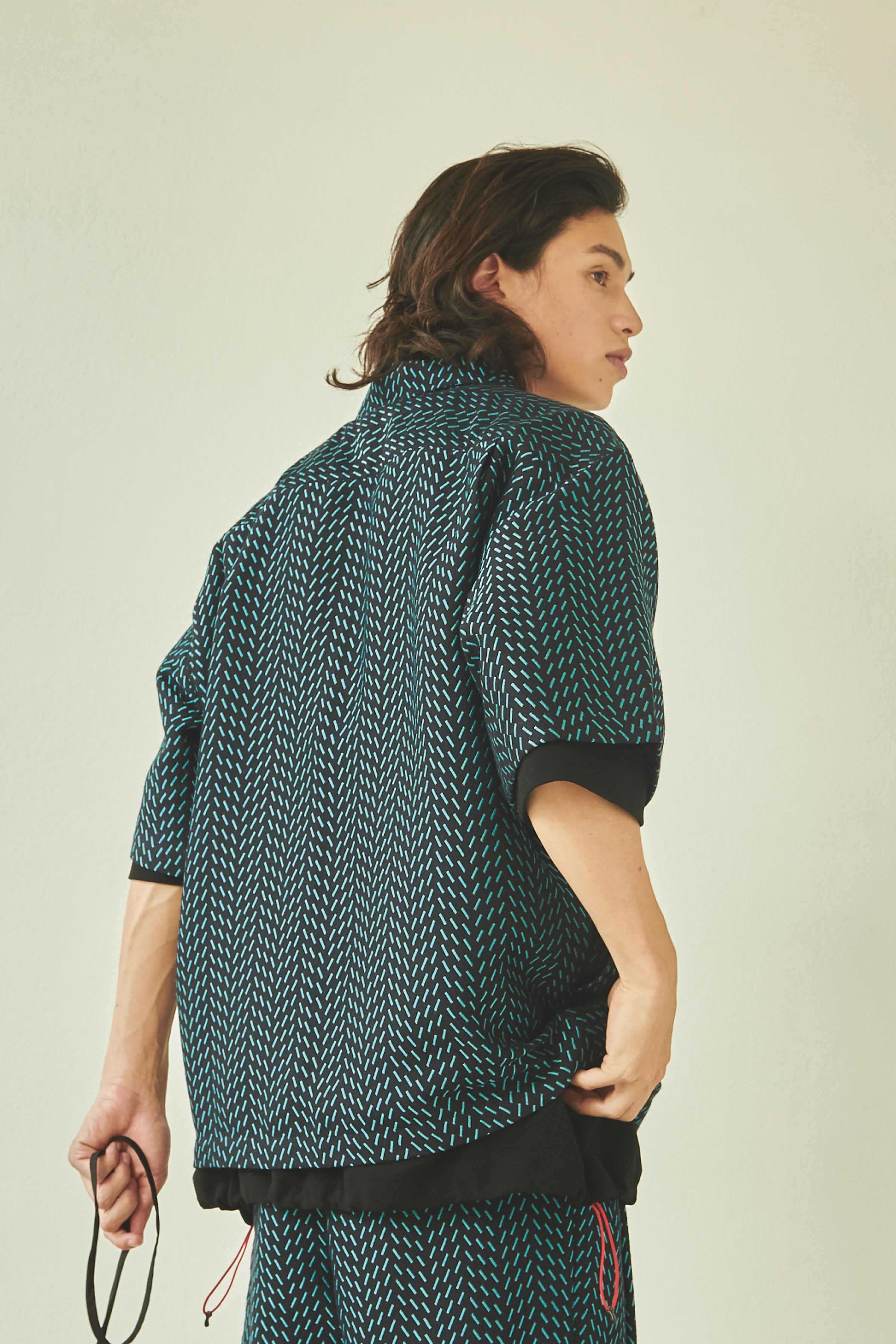 ヘリンボーン柄のジャガード素材を使用したハーフスリーブシャツジャケット。