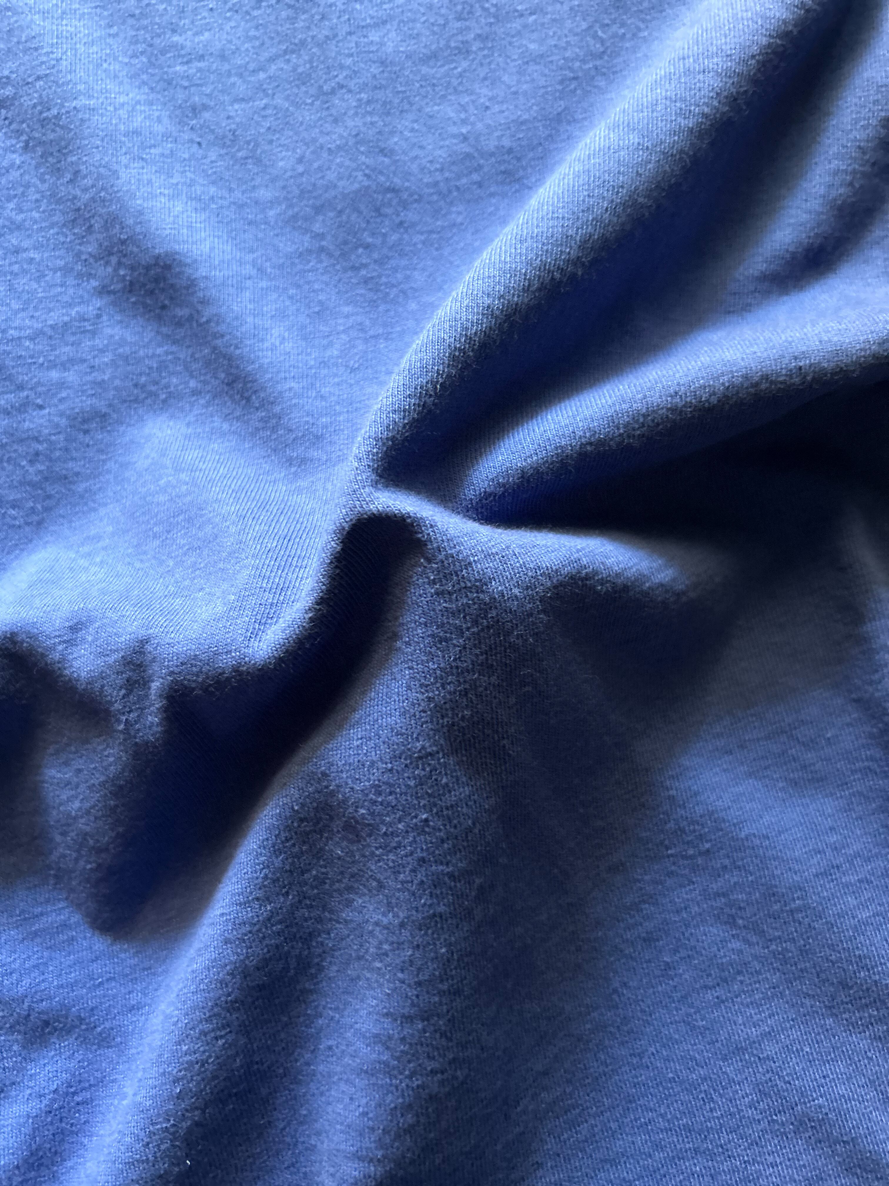和歌山にある希少な吊り編み機で作られた生地を採用したややゆったりの落ち着きのあるTシャツです。肉厚なのに柔らかいのが吊り編み機の特徴で空気を加えながら糸にストレスなく編み立て独特の風合いに仕上がってます。色味もフェード感ある綺麗な色で沢山きて経年変化も楽しめる愛着のある1枚です。