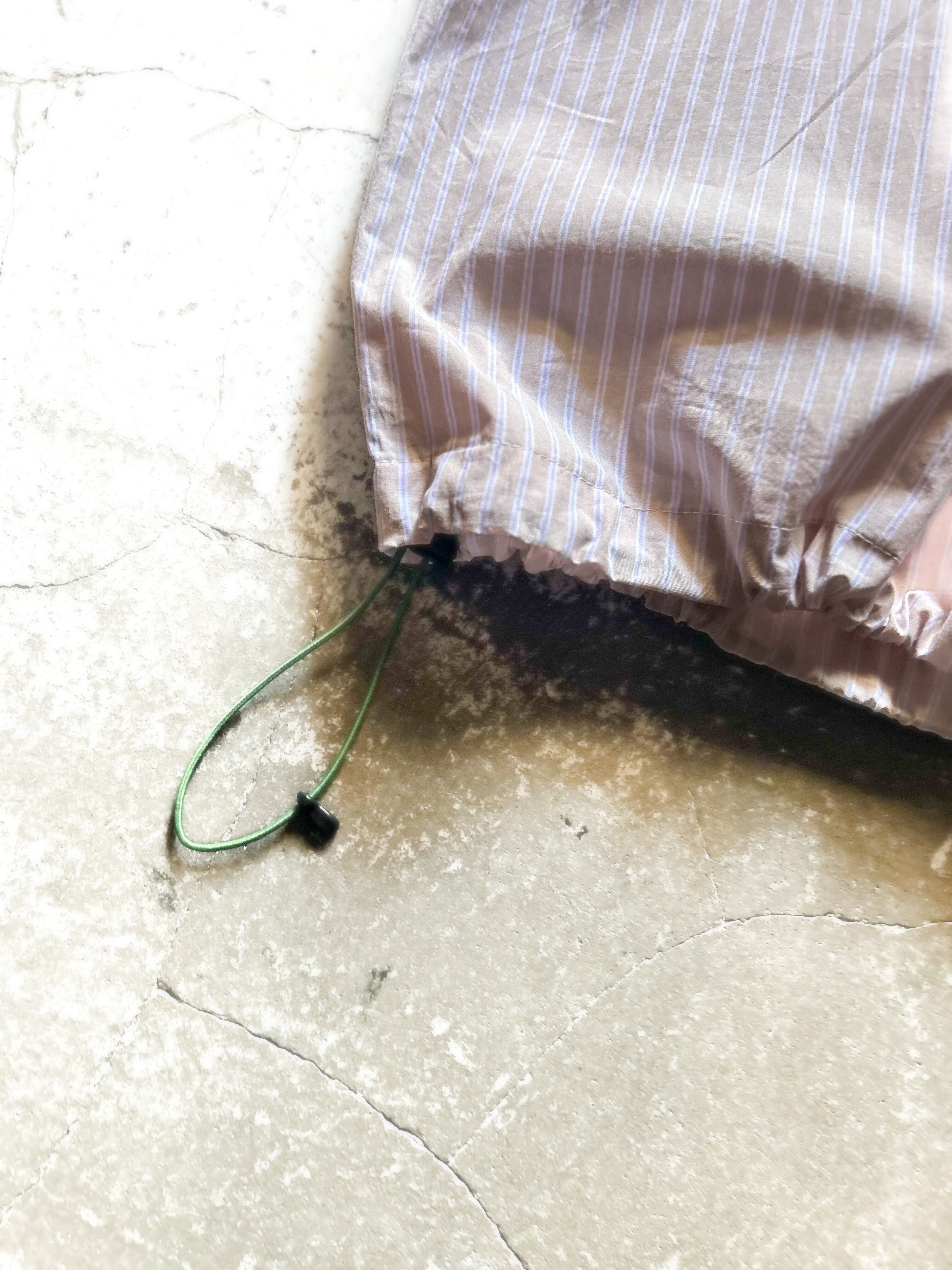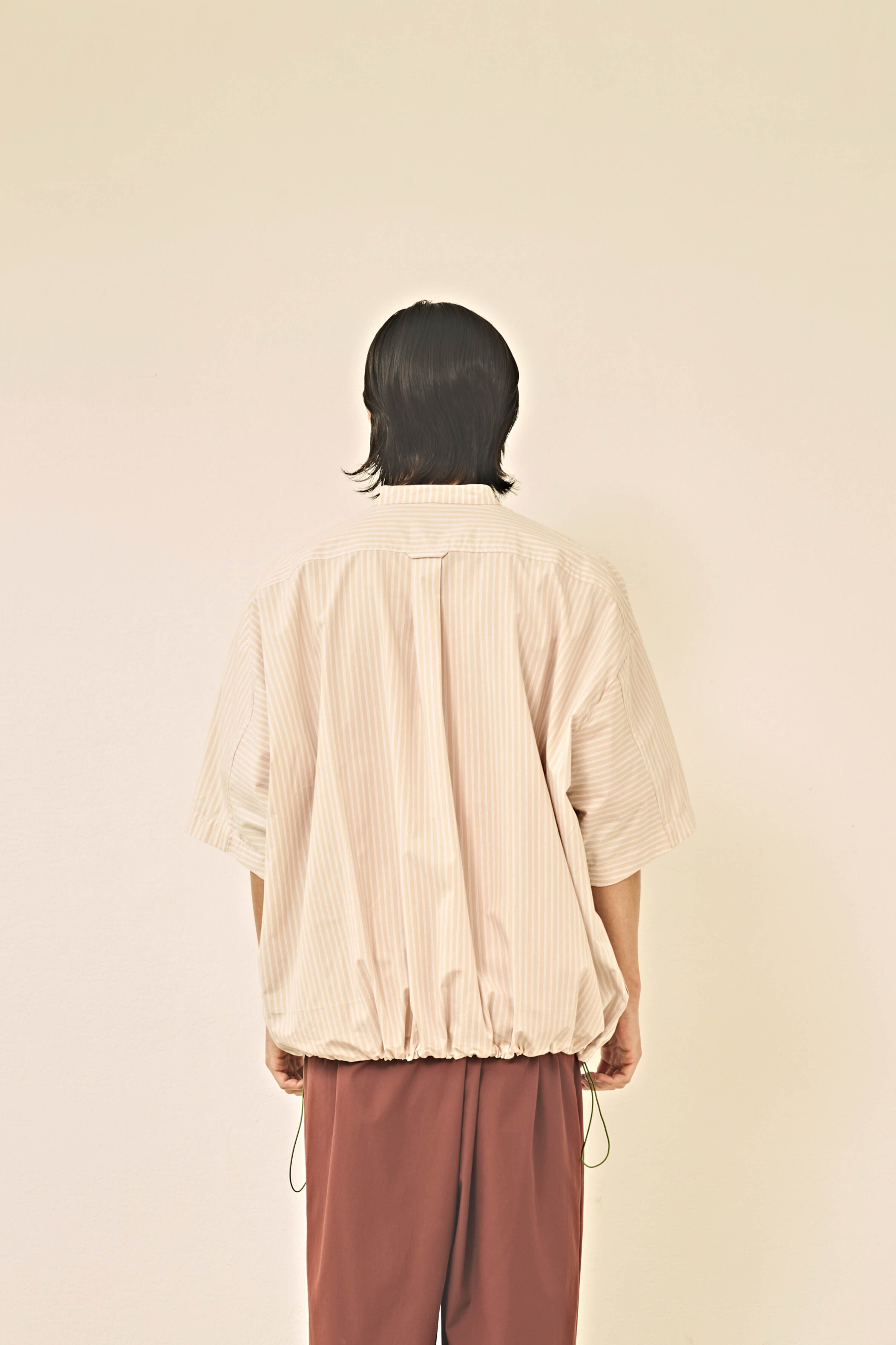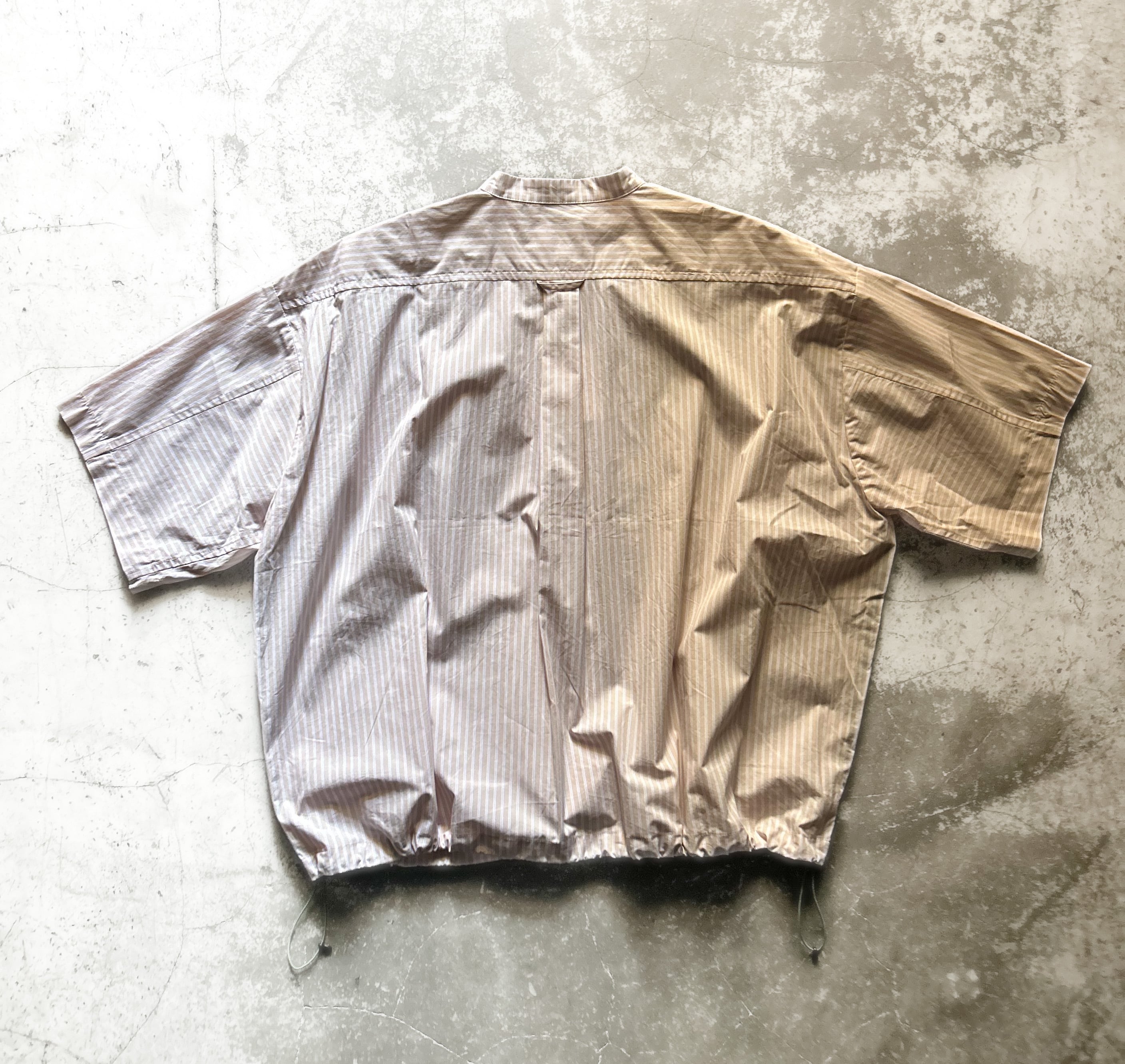 ピッチの細かいマルチストライプ柄のバンドカラーシャツ。リングドットボタンがミニマルきれない印象。大胆に身幅を広くして裾には配色のスピンドルが入りバルーンシルエット形成