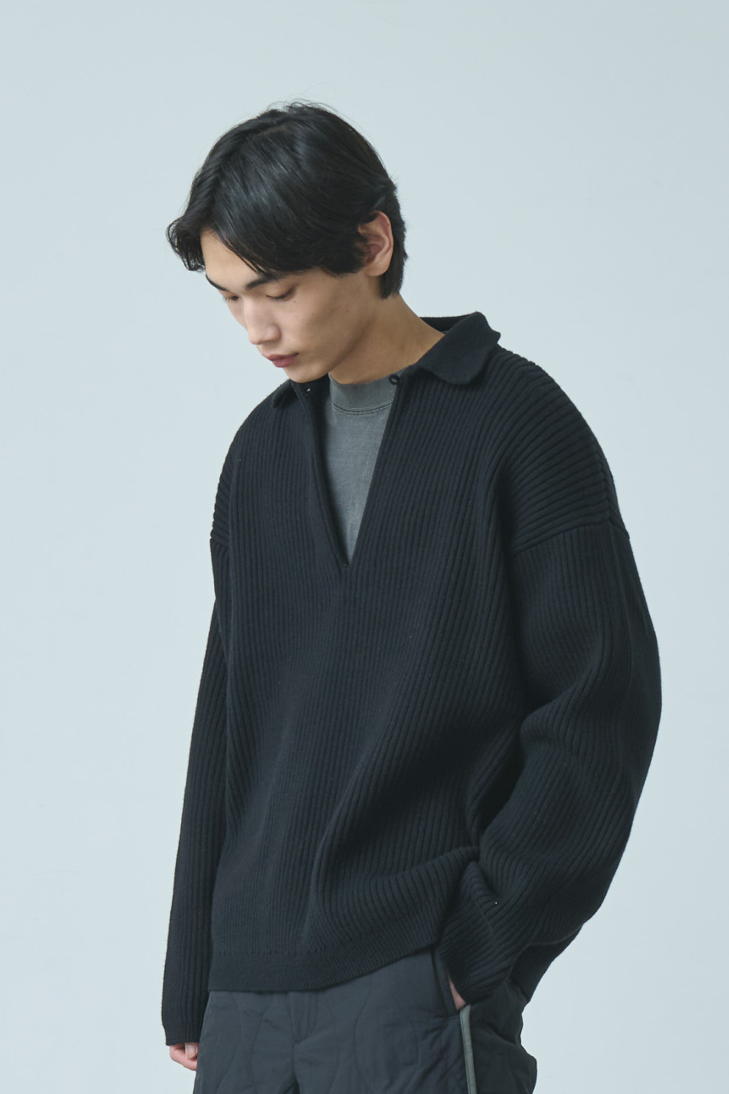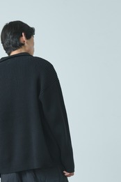 胸元の深いスリット開きが特徴のビッグニットトップ。袖口や裾のサイズを絞ることで出した全体的に膨らみがあるシルエットが特徴。太い畝のリブに編み立てた素材感はウォーム感がある着用が可能。胸元に釦付きでVラインのシルエットを広げずに着用も可能。