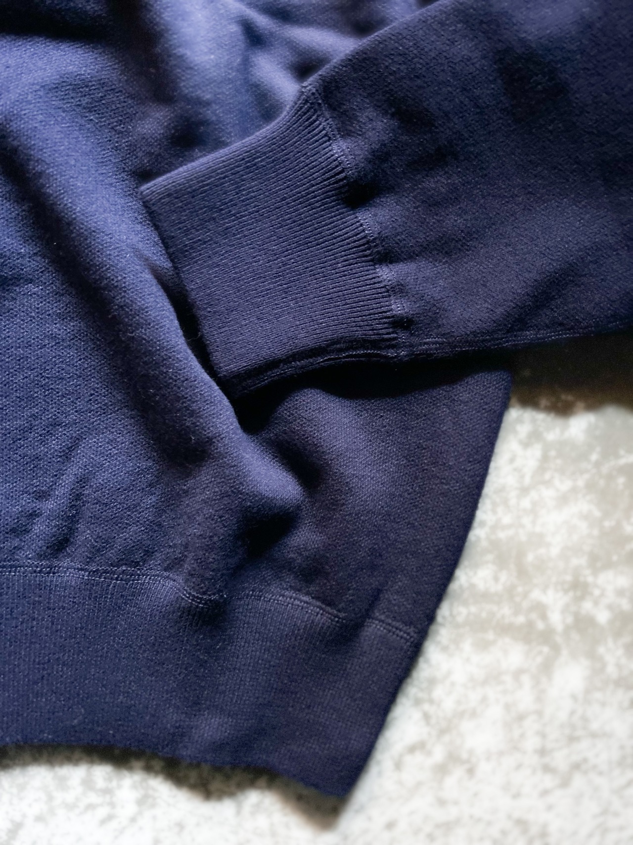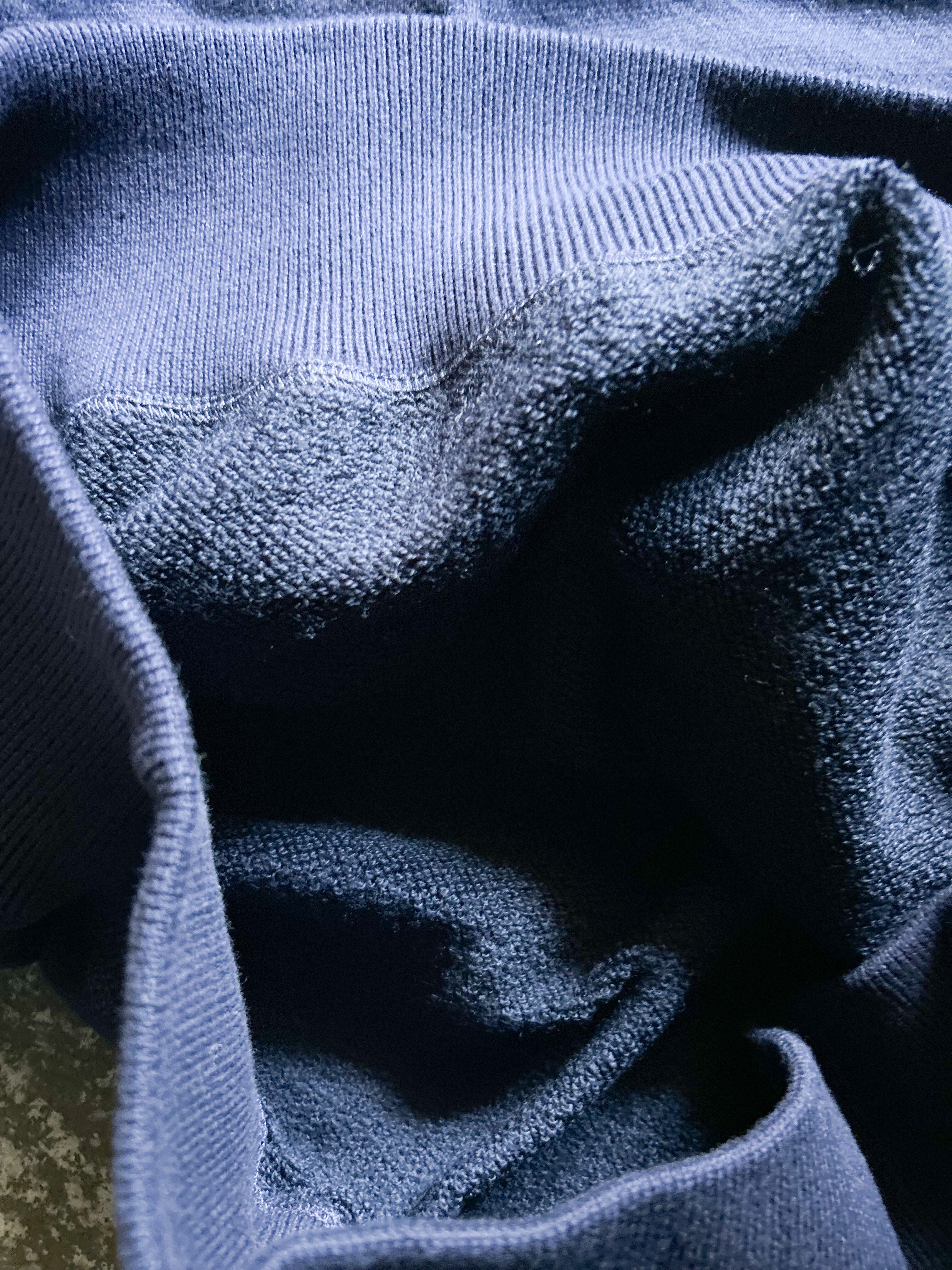表面はコットンを使用し、スウェットのような表情ですが、裏面は18マイクロンのメリノウールを独自の製法でパイル状にした、柔らかいふんわりとした肌触りが特徴のニットです。